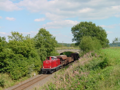 Übergabegüterzug mit V100 an der Feldwegbrücke bei Meudt auf der Westerwaldquerbah